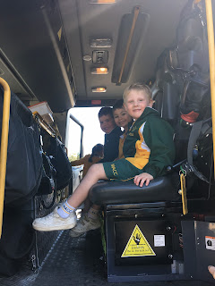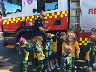 After crunch n sip, we had a surprise visit from the Narellan Fire Brigade. We re-learnt to call 000 in and emergency and Liam said we need to tell them "we have a fire". Charlie told us to 'meet at our letterbox' when we need to evacuate our house. Kaiah told us 'drop on the floor and when the fires off, go outside', in response to "What do you do if your clothes catch fire?" The fireman told us to cover our face with our hands and STOP! DROP! And ROLL! to put the fire out. The fireman also demonstrated how we get outside we 'GET DOWN LOW and GO, GO, GO!"